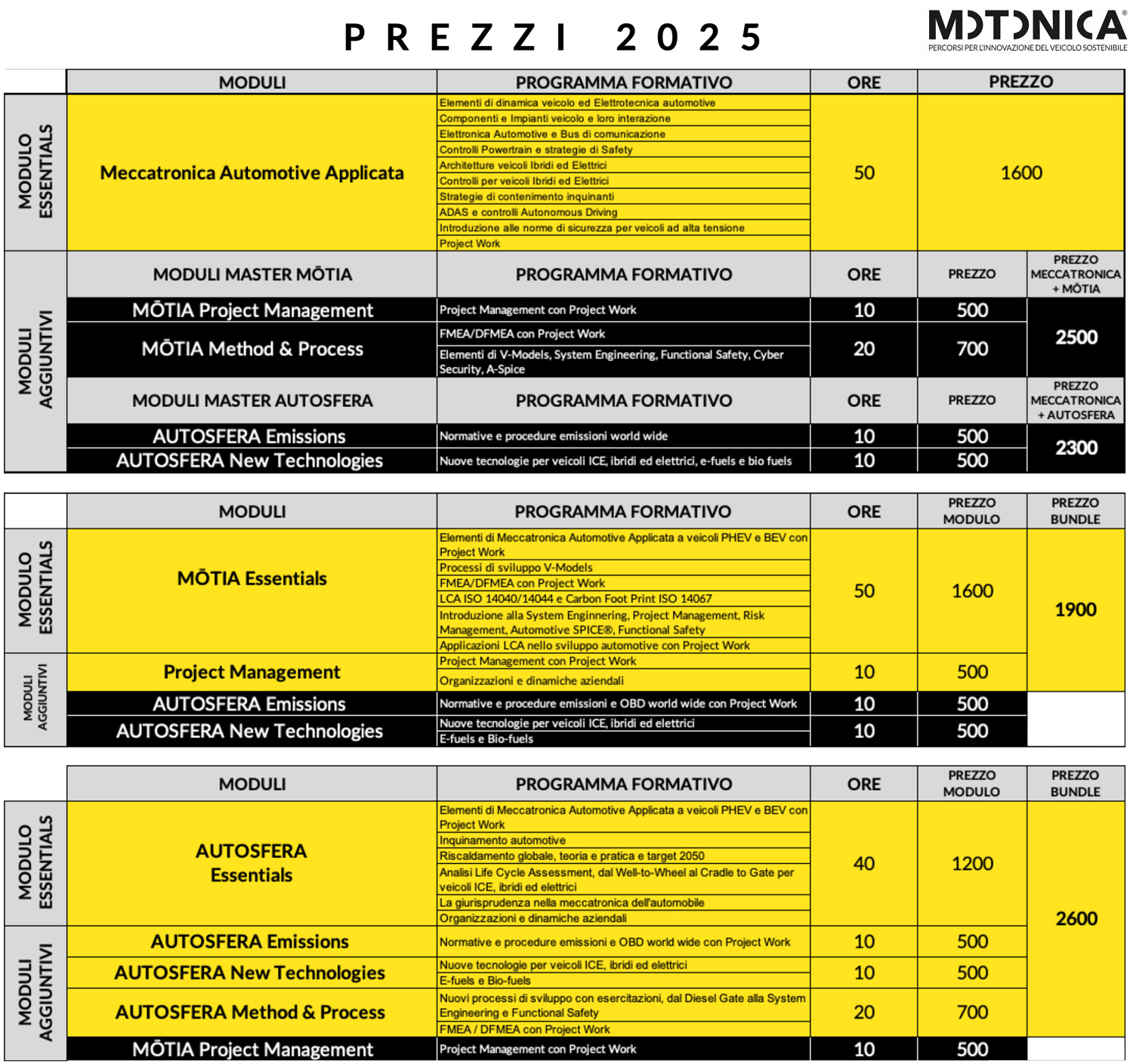 Il corso online Meccatronica Automotive Applicata fornisce le basi della meccatronica di un powertrain di un veicolo, a partire dai tradizionali ICE con solo motore termico fino ai più complessi ibridi, PHEV e vetture elettriche. Il corso è anche propedeutico ai nostri Master Autosfera e Motia per chi non ha un background tecnico.